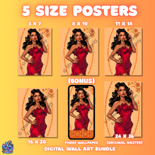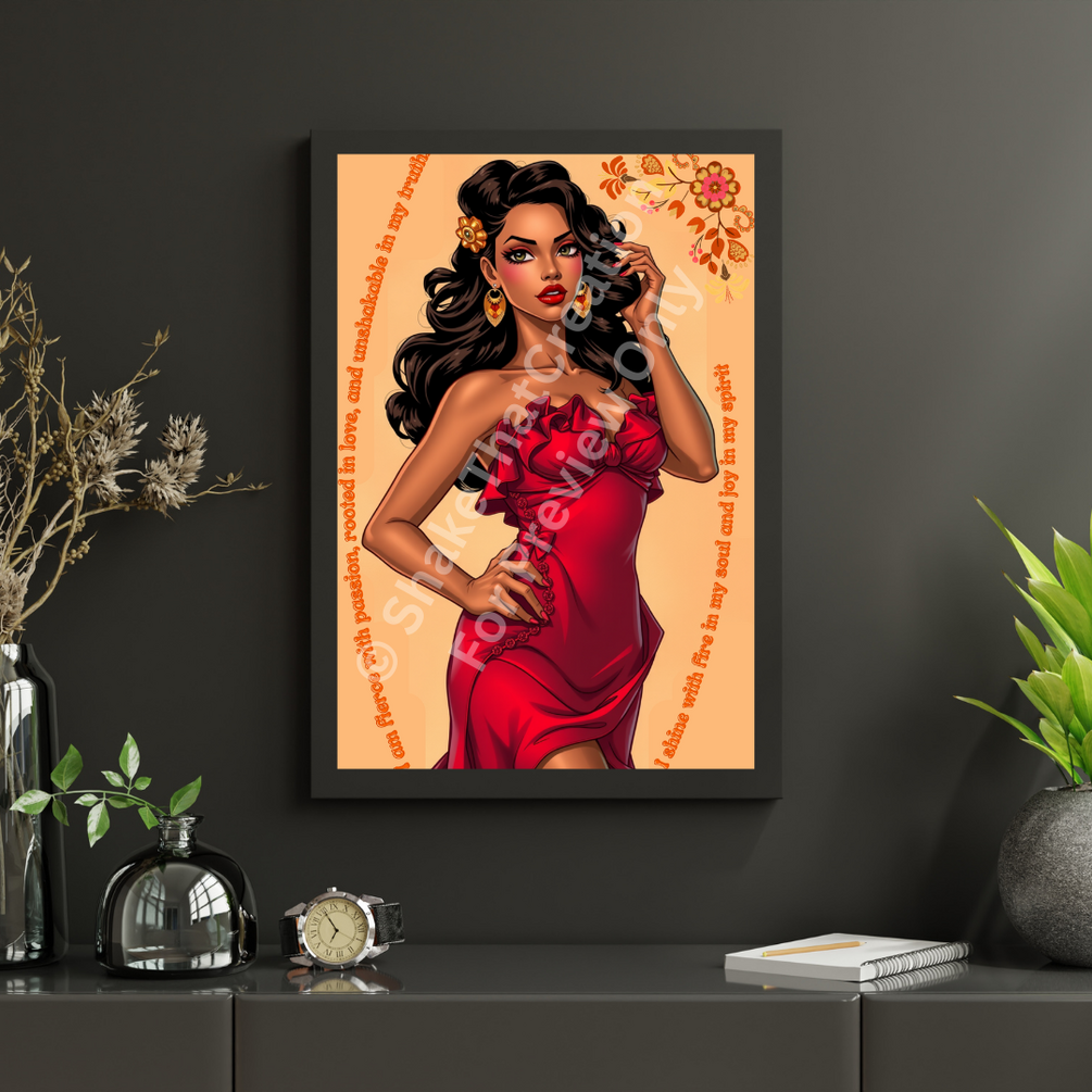 Unleash your inner fire with this stunning Fierce Passion Affirmation print — a powerful visual mantra for self-love, rootedness, and radiant confidence. Perfect for any woman reclaiming her power, this digital artwork features a bold Afro-Latina goddess in a vibrant red dress, framed by an empowering affirmation:
